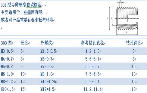 24h咨询热线13069364703 薄壁型盐城自攻螺套外观上看主要有两种区分,一种是一端开槽型的,另一种是一端三圆孔型的,其中开圆孔型的又分为307型和308型两种,307型和308型外观主要区别就是同一直径下,长度和外径大小有所区分。以上各种型式螺套均具有自行攻牙功能。